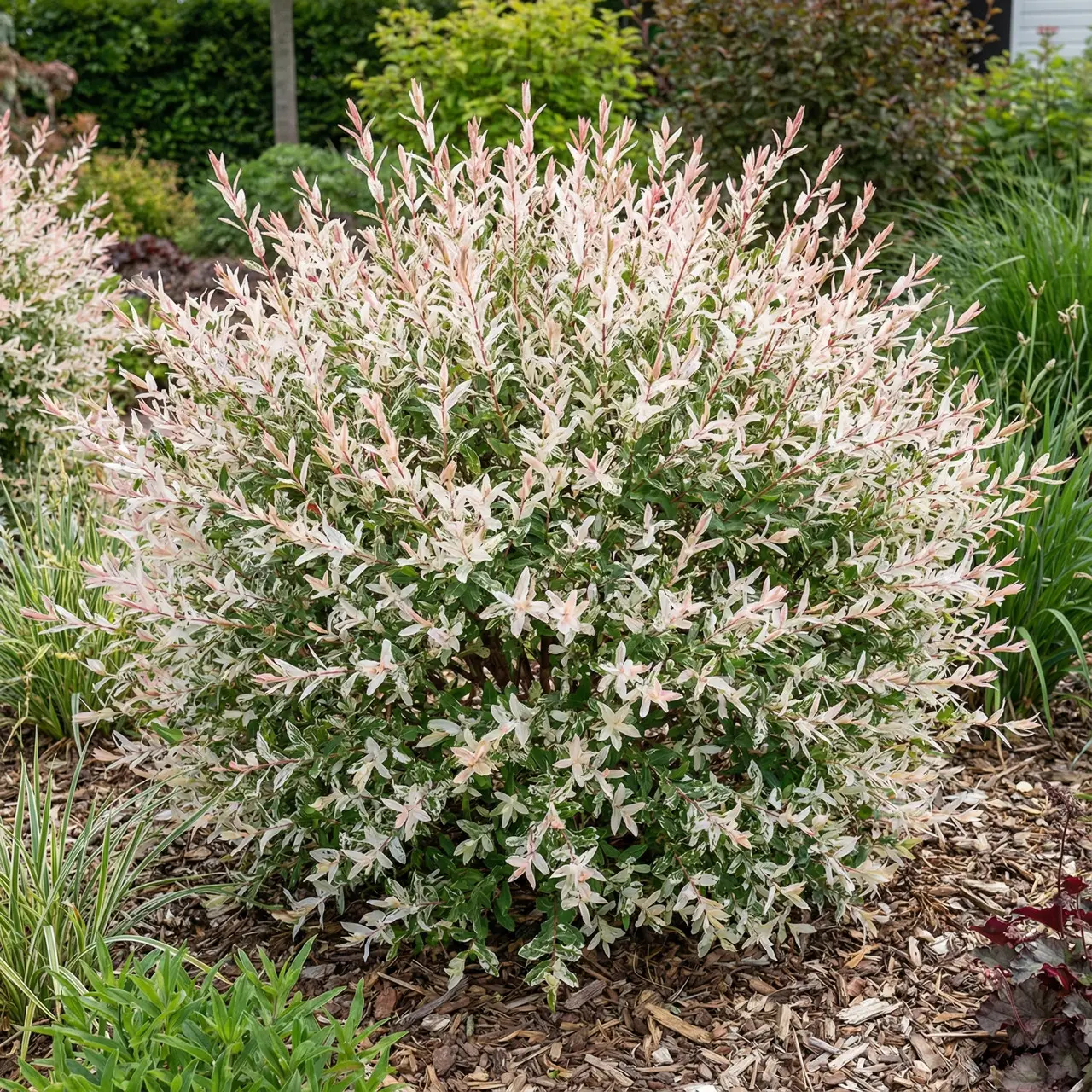 Верба Хакуро Нішики / Salix integra ‘Hakuro Nishiki’ — декоративний листопадний кущ, який вирізняється надзвичайно ефектним строкатим листям та витонченою формою крони. Рослина формує щільний, округлий або напівкулястий кущ із тонкими, гнучкими пагонами, що надає їй легкого, повітряного вигляду. Висота дорослого куща зазвичай становить 1,5–2,5 м, ширина — до 2 м, що робить її ідеальним акцентом у садових композиціях.