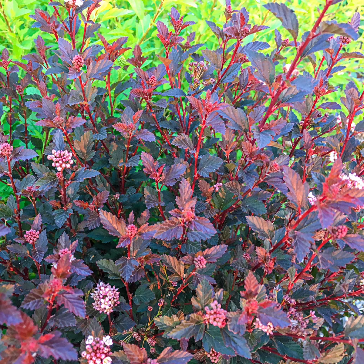 Пухироплідник Center Glow / Physocarpus opulifolius Center Glow — декоративний листопадний чагарник, який вирізняється контрастним двоколірним забарвленням листя та високою декоративністю протягом усього сезону. Сорт формує густий, розлогий кущ із міцними вертикальними пагонами, який зберігає привабливу форму без складного догляду. Листя трилопатеве, щільне, з яскраво вираженим декоративним ефектом: основа листка має насичений золотисто-жовтий відтінок, тоді як центральна частина (вздовж жилок і серединної зони) забарвлена у глибокі червоно-бордові та пурпурові тони. Саме цей контраст створює ефект «світіння зсередини», завдяки чому сорт і отримав назву Center Glow. Впродовж сезону інтенсивність кольорів може змінюватися: на сонці жовті тони стають яскравішими, а бордові відтінки — більш насиченими.