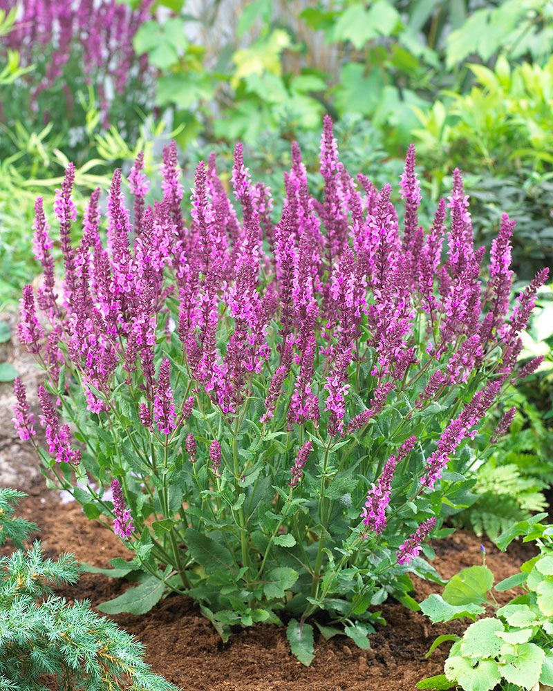 Шавлія Synchro Pink / Salvia nemorosa Synchro Pink – декоративна багаторічна ароматна рослина, яка формує компактний, акуратний кущ правильної форми з густим сірувато-зеленим листям та ніжними колосоподібними суцвіттями рожевого кольору. Цвіте рясно з початку літа до серпня, утворюючи велику кількість квітконосів, а після обрізки здатна до повторного цвітіння. Висота рослини становить 40–50 см, що робить її ідеальною для бордюрів, міксбордерів, а також вирощування у контейнерах. Сорт вирізняється рівномірним цвітінням і чудово поєднується з іншими багаторічниками, особливо у пастельних композиціях. Приваблює бджіл і метеликів, створюючи живу атмосферу в саду.